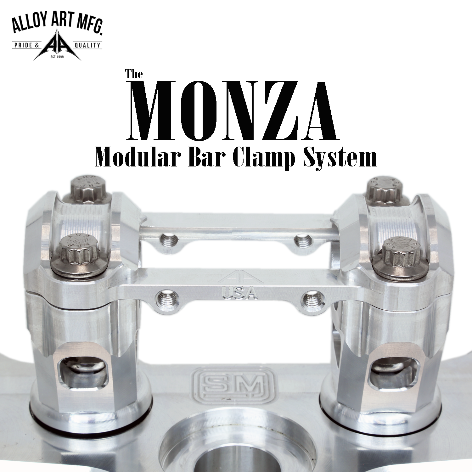 Monza BCS Modular Bar Clamp System The is the first offering base model of what’s to come. Multi height straight or pullback options just around the corner . Featuring a lightweight trestle / skeletal style design. Handlebar degree indicators. All ARP hardware including riser bolts. 1/4-20 threaded accessory / gauge mounting options. We feel the design and look has great range as far as fitting in and looking great across many types of builds. From FXR - Chopper - Bagger and everything in between.